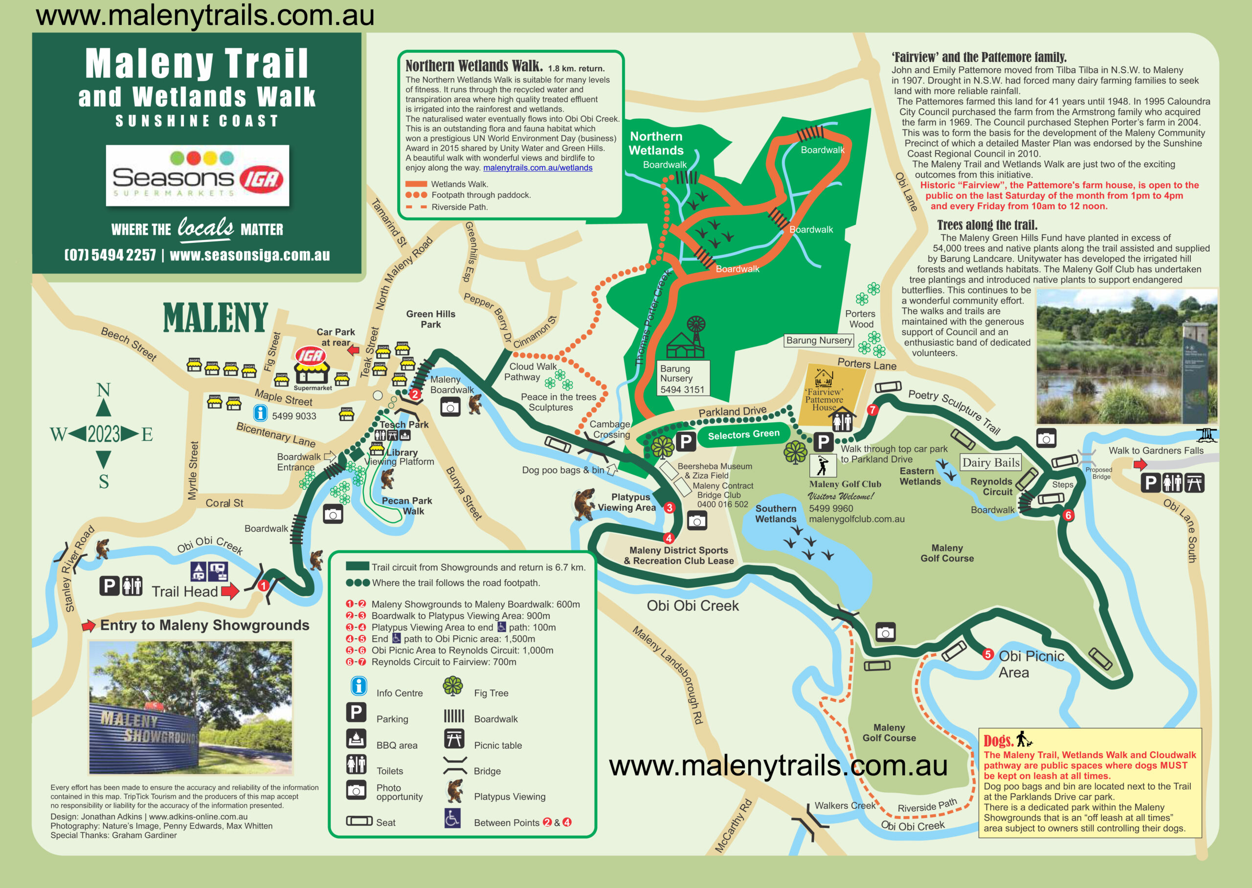The Obi Obi Boardwalk is part of the Maleny Trail Circuit established as part of the Maleny Community Precinct. The full circuit is 6.7km starting at the Maleny Showgrounds.